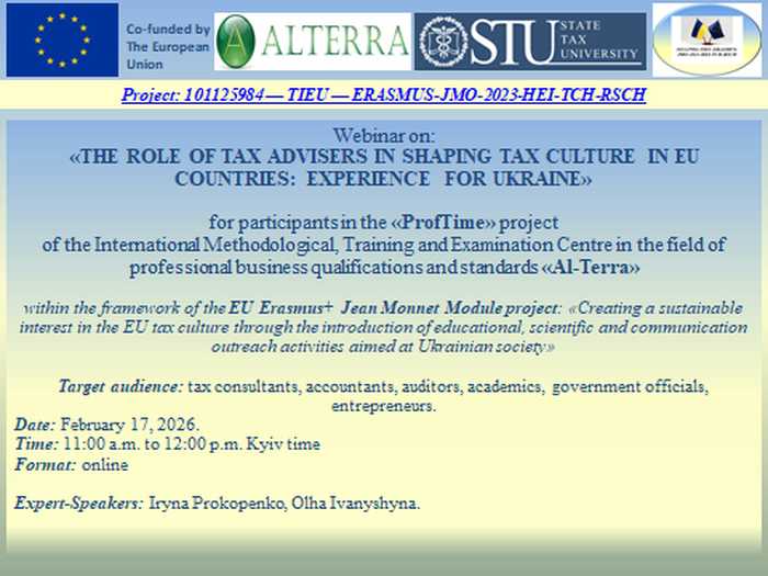 17.02.2026 відбувся вебінар для учасників проєкту «ПрофТайм» Міжнародного методологічного, навчального та екзаменаційного центру у сфері професійних бізнес-кваліфікацій та стандартів «Аль-Терра» в рам...