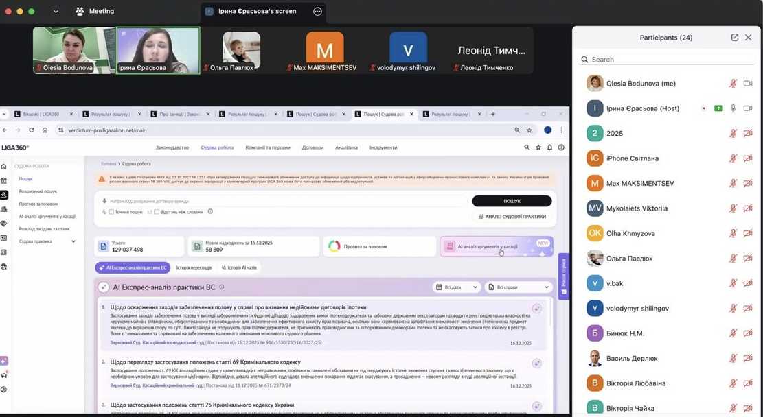 Навчання було організоване для викладачів Навчально-наукового інституту права. У форматі тренінгу Ірина Єрасьова представила основні можливості програмного забезпечення ЛІГА:ЗАКОН, детально ознайомила з функціоналом платформи й продемонструвала, як ефективно використовувати її у викладацькій діяльності. Практична частина була побудована на основі кейсів, наданих самими викладачами.