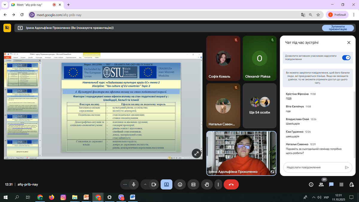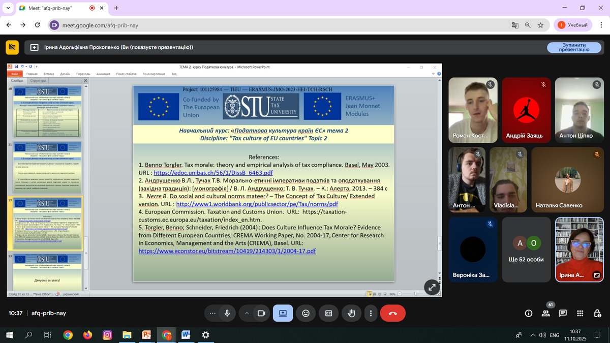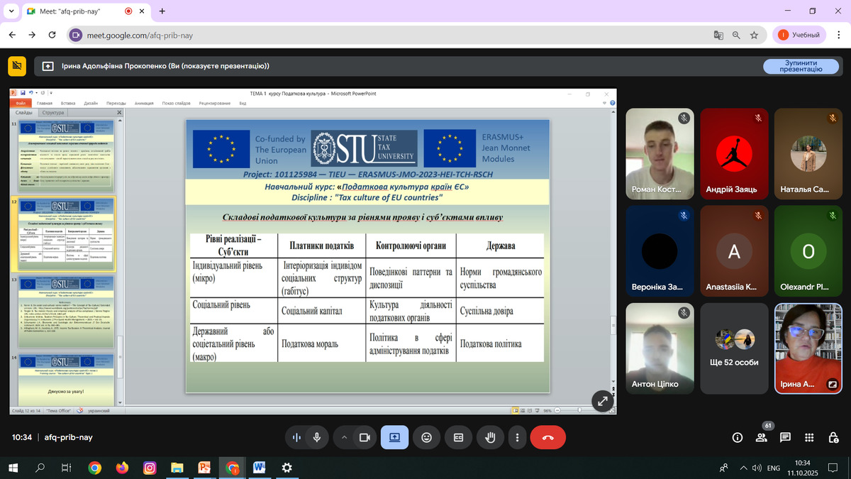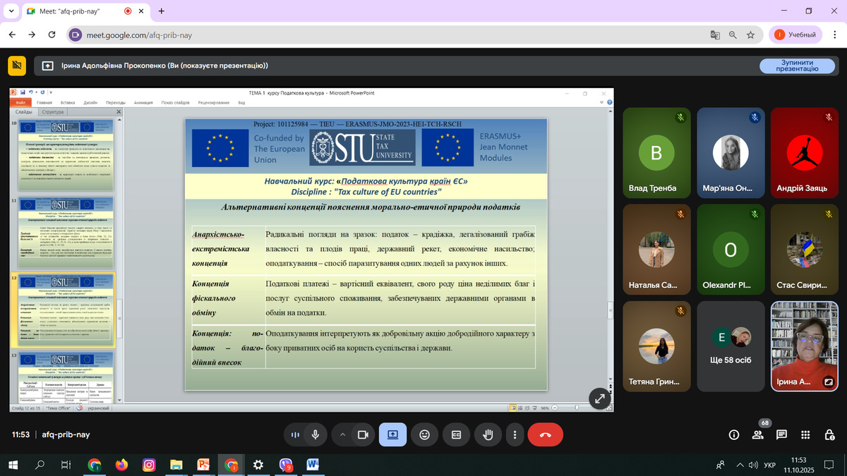On October 11, 2025, the State Tax University held regular classes of the elective course: “Tax Culture of EU Countries” as part of the EU Erasmus+ Project “Forming a sustainable interest in EU tax culture through the introduction of educational, scientific, and communicative awareness-raising activities aimed at Ukrainian society” 101125984 – TIEU – ERASMUS-JMO-2023-HEI-TCH-RSCH.