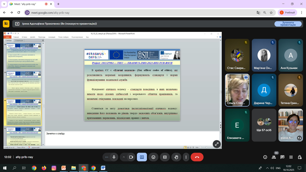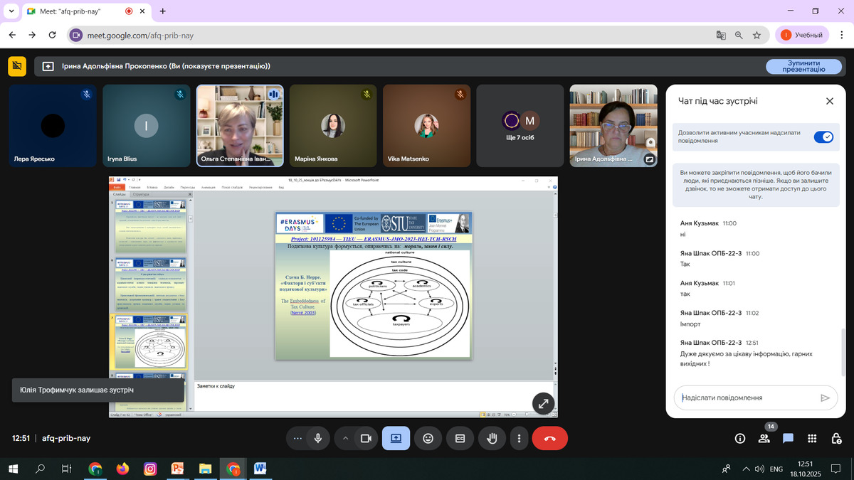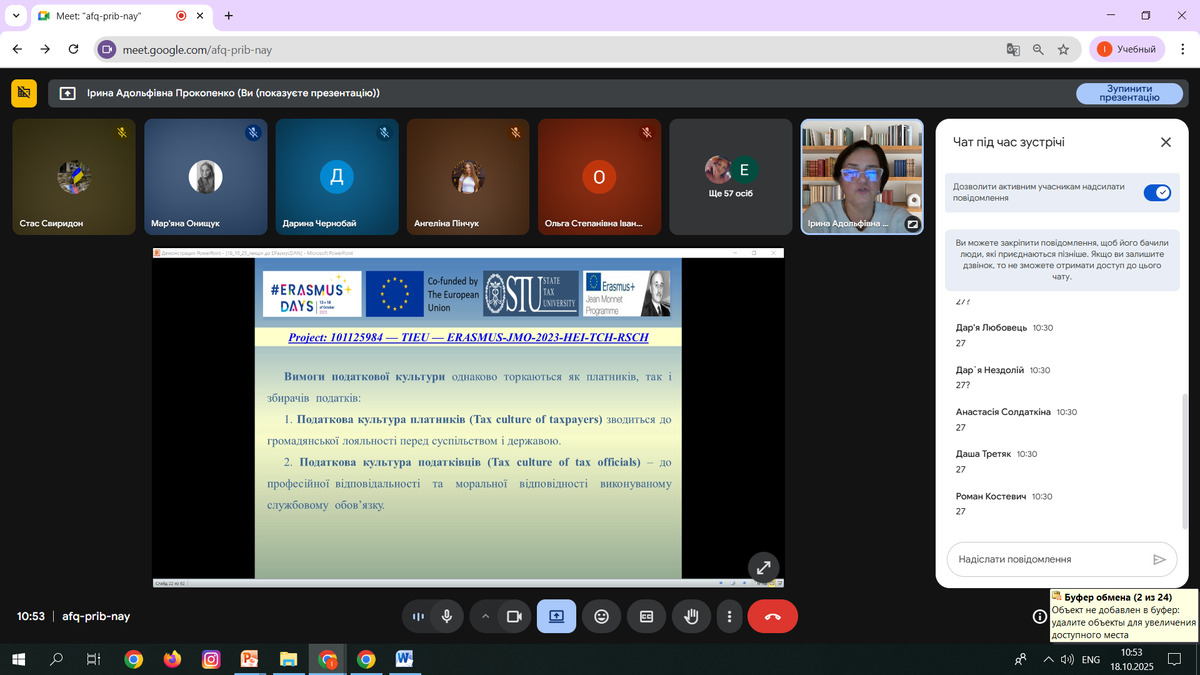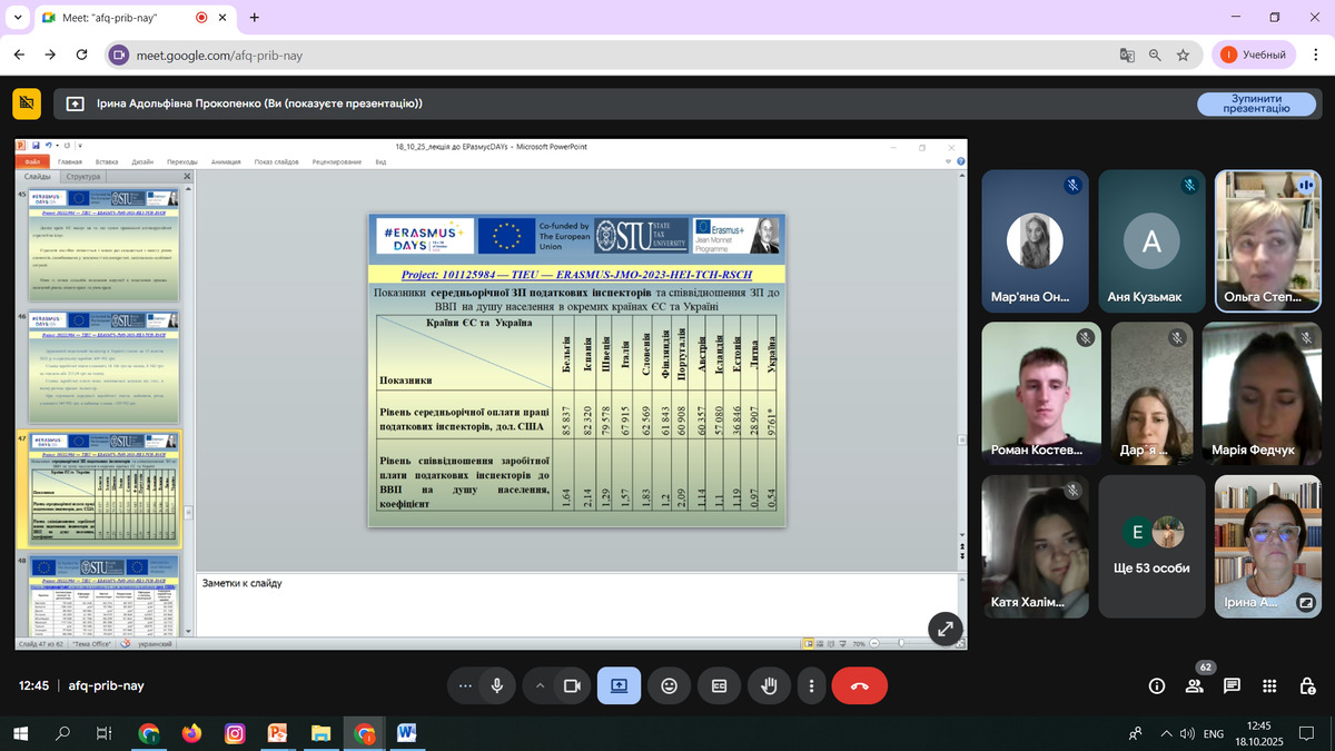 On 18 October 2025, the State Tax University hosted a webinar that was part of the international initiative # ErasmusDays2025 initiative and implemented within the Erasmus+ Jean Monnet Module project: «Forming a sustainable interest in EU tax culture through the introduction of educational, scientific and communicative awareness-raising activities aimed at Ukrainian society».