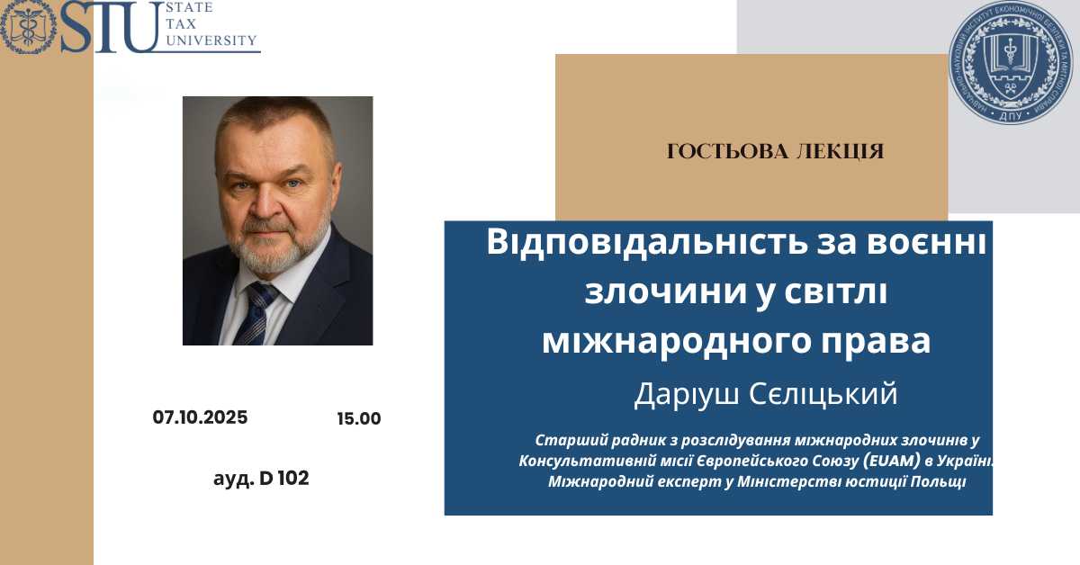 Гостьова лекція Даріуша Сєліцького - Старшого радника з розслідування міжнародних злочинів у Консультативній місії Європейського Союзу (EUAM) в Україні, міжнародного експерта у Міністерстві юстиції По...
