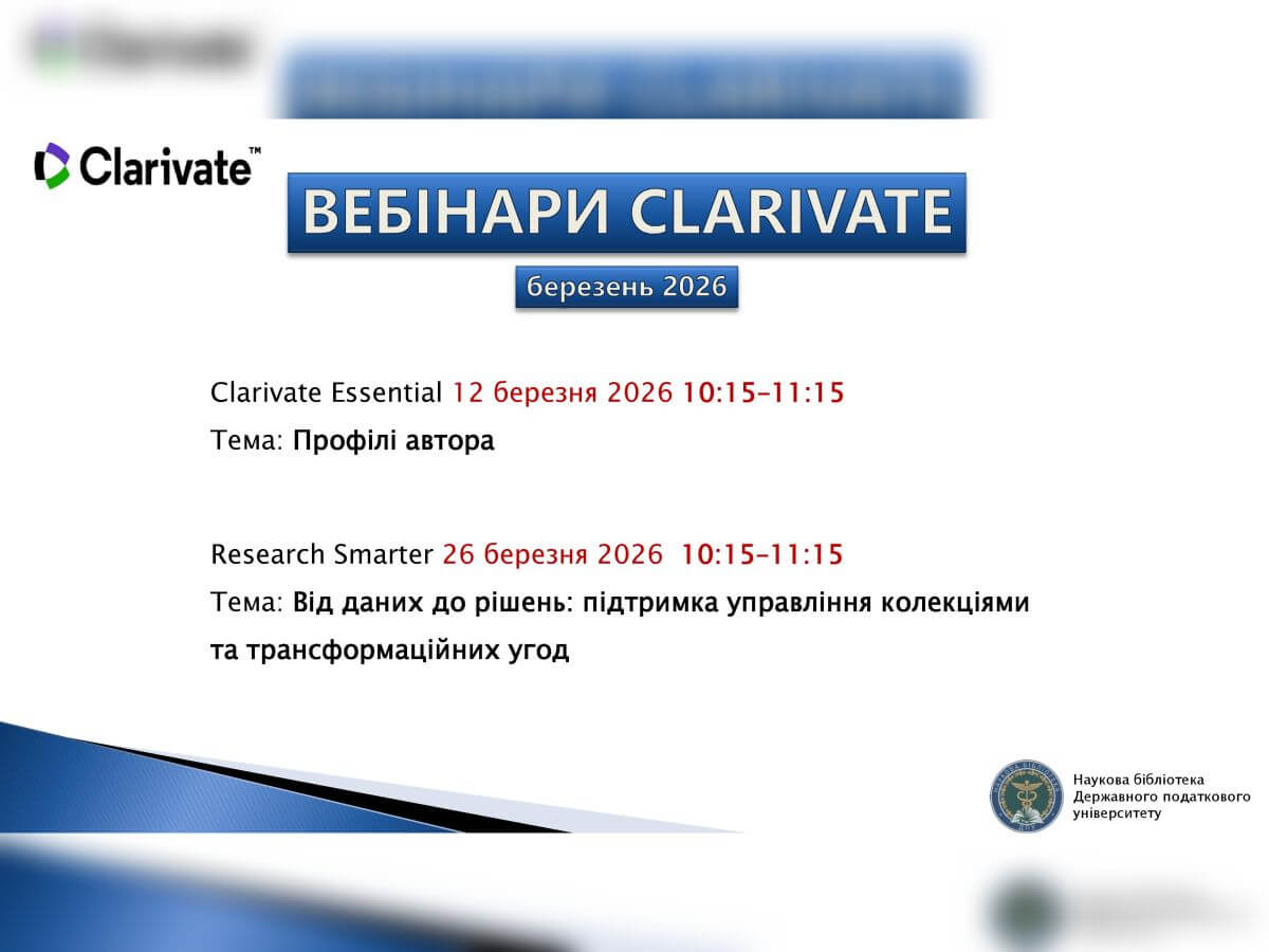 Наукова бібліотека Державного податкового університету запрошує дослідників та керівників підрозділів на серію вебінарів від компанії Clarivate у березні 2026 року.
