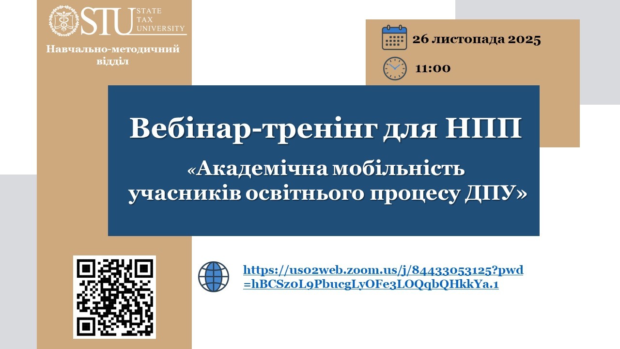 Шановні колеги! Запрошуємо Вас взяти участь у вебінарі-тренінгу «Академічна мобільність учасників освітнього процесу ДПУ» для науково-педагогічних працівників, що відбудеться 26 листопада 2025 о 11:00...