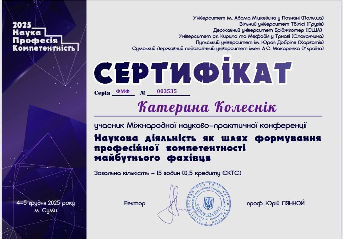 4–5 грудня учасники математичного гуртка «Актуальні проблеми сучасної математики» долучилися до Міжнародної науково-практичної конференції «Наукова діяльність як шлях формування професійних компетентн...