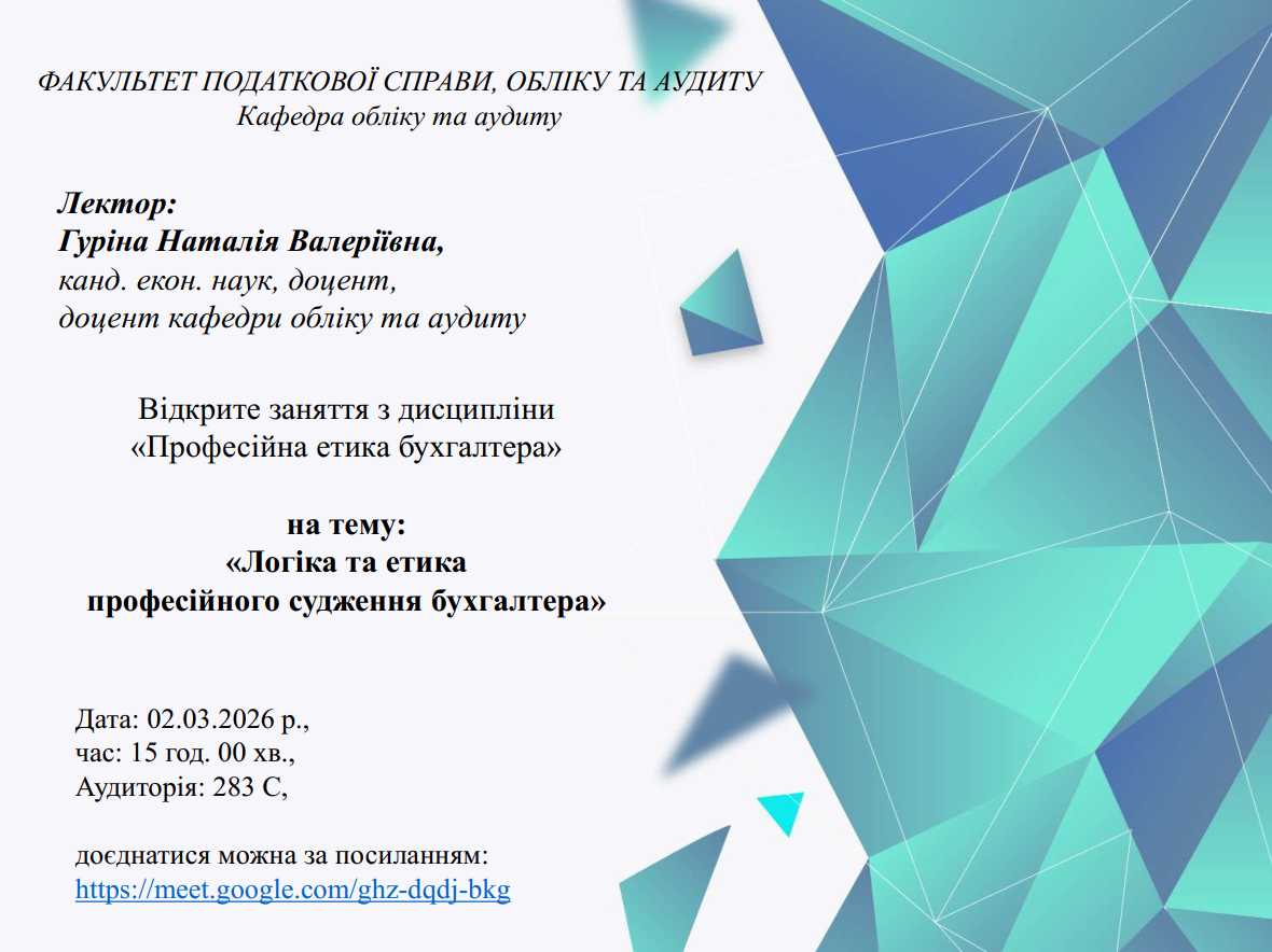 02.03.2026 р. о 15:00 (5 пара, ауд. C283) у групі ОБ-22-2 відбудеться відкрите лекційне заняття доцента кафедри обліку та аудиту Гуріної Наталії Валеріївни з навчальної дисципліни «Професійна етика бу...