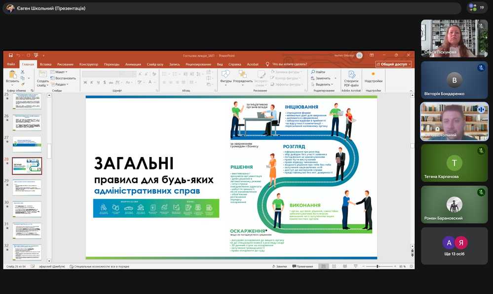Не стала винятком і гостьова лекція на тему «Загальна адміністративна процедура», яка відбулася 13 квітня в рамках дисципліни «Адміністративне право». Лекцію для студентів першого курсу освітньо-професійної програми «Правоохоронна діяльність» провів Євген Школьний, кандидат юридичних наук, експерт з питань публічної адміністрації Центру політико-правових реформ.