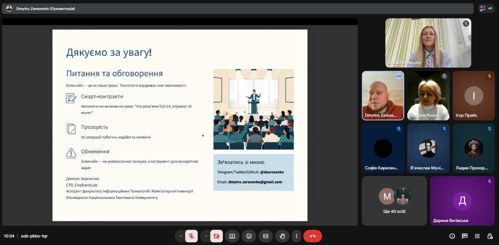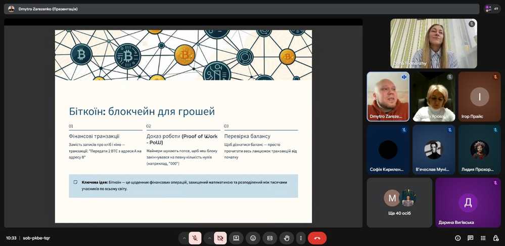 Під час лекції було розглянуто еволюцію фінансової інфраструктури, обмеження централізованих систем, принципи роботи Distributed Ledger Technologies, криптографічні основи блокчейну та математичний фундамент механізму Proof of Work. Особливий інтерес викликало поєднання глибокого теоретичного аналізу з практичними прикладами впровадження blockchain-рішень у міжнародних проєктах.