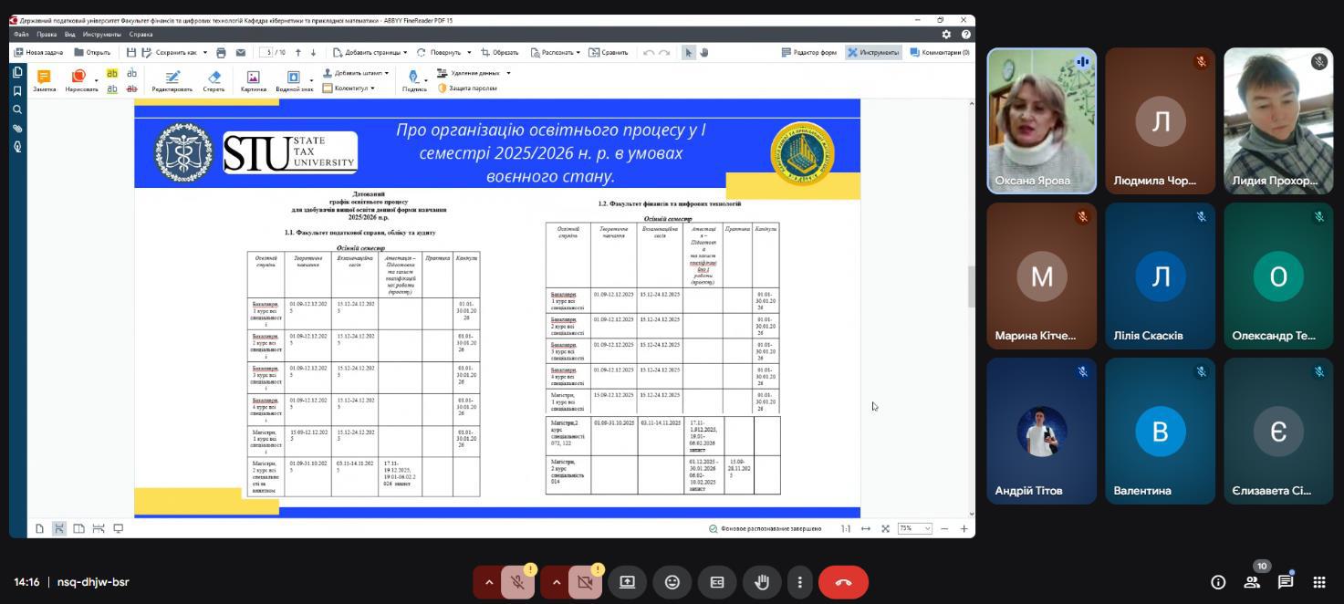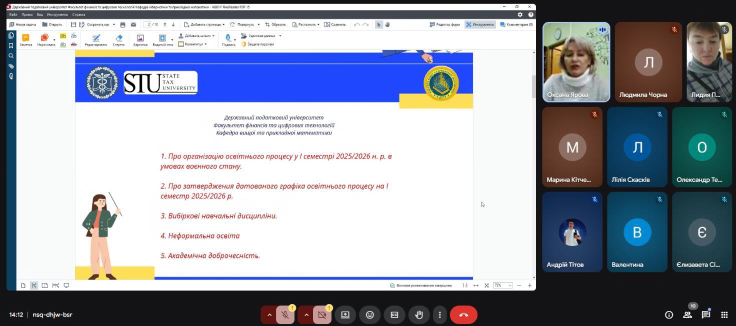 8 жовтня 2025 року відбулася онлайн-зустріч здобувачів вищої освіти другого (магістерського) рівня вищої освіти ОП «Середня освіта: математика» факультету фінансів та цифрових технологій Державного податкового університету з гарантом освітньої програми доктором фізико-математичних наук, професором, професором кафедри вищої та прикладної математики Семком М. М., а також науково-педагогічними працівниками в рамках інформаційно-організаційної роботи на початку нового навчального семестру.