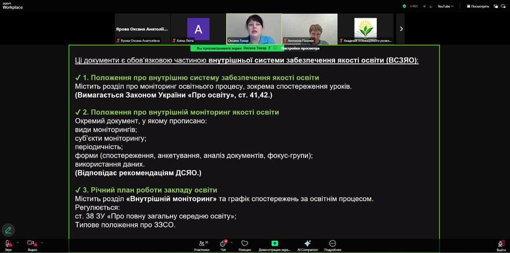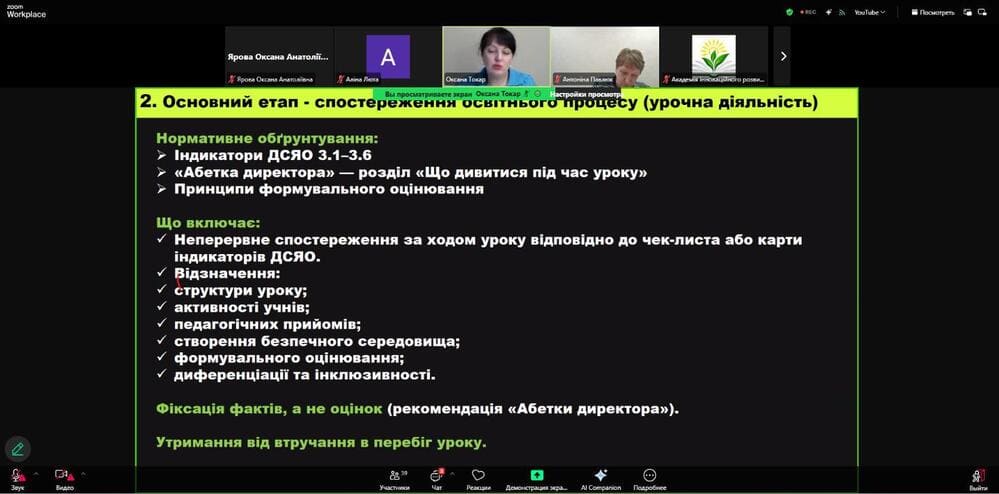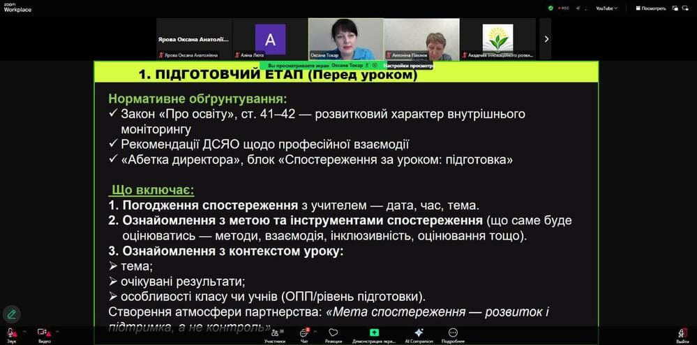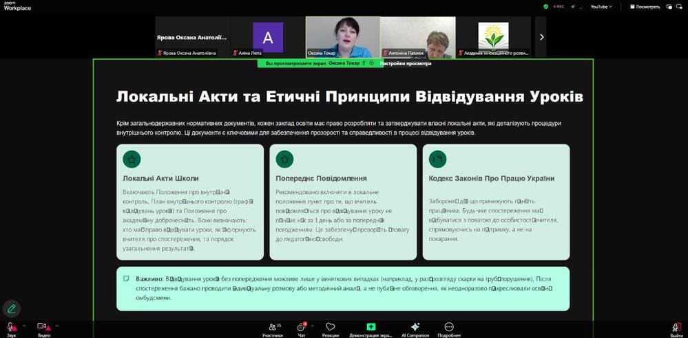 Учасники ознайомилися з нормативно-правовими засадами внутрішнього контролю, сучасними моделями спостереження (коучинговою, партнерською, розвитковою), етапами підготовки та проведення відвідування уроку, а також отримали практичні інструменти - шаблони, чеклісти й орієнтовні запитання для професійної бесіди.