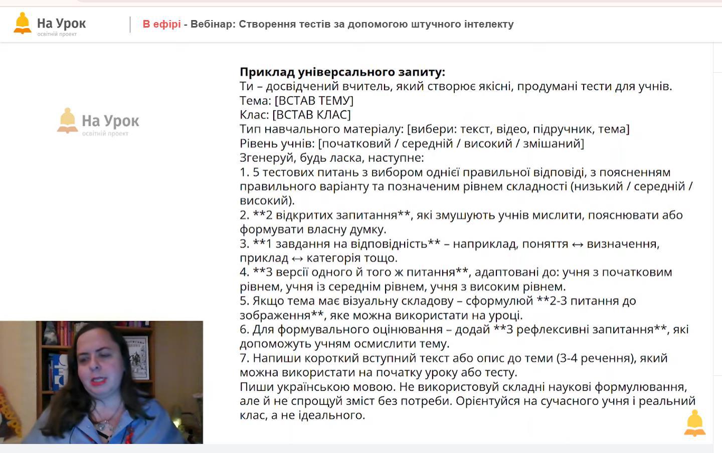 - Практичні приклади – генерацію тестів на основі тексту, відео чи теми уроку.