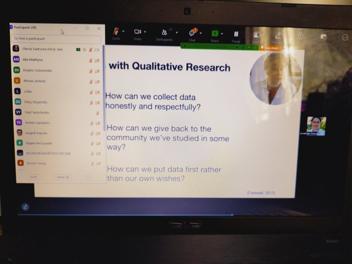 У своїй доповіді лектор зосередив увагу на ключових елементах проведення якісного наукового дослідження різноманітними методами та прийомами, які є звичними для науковців в США. У цій лекції Джонатан Ціско розглянув основні елементи якісних методів, що використовуються в дослідженнях у США, а також дослідницькі парадигми, які ґрунтують свою роботу на якісних методах. Також на лекції разом із здобувачами освіти Джонатоном було обговорено якісні дизайни та розглянуто приклади дослідницьких питань, які самі по собі підходять для якісного аналізу.