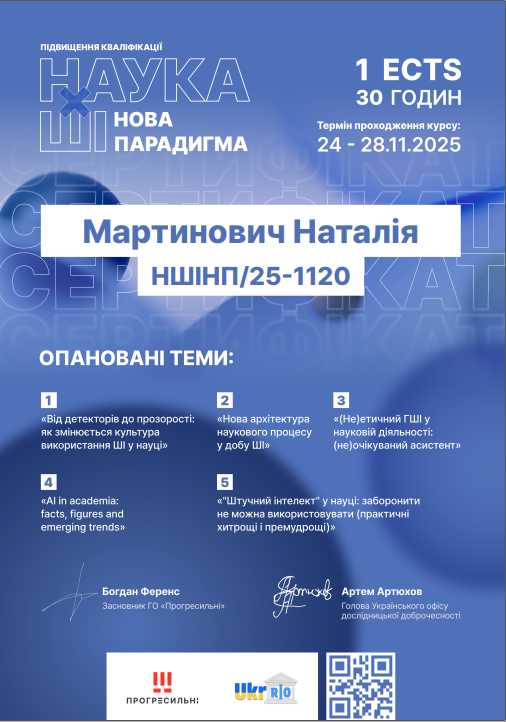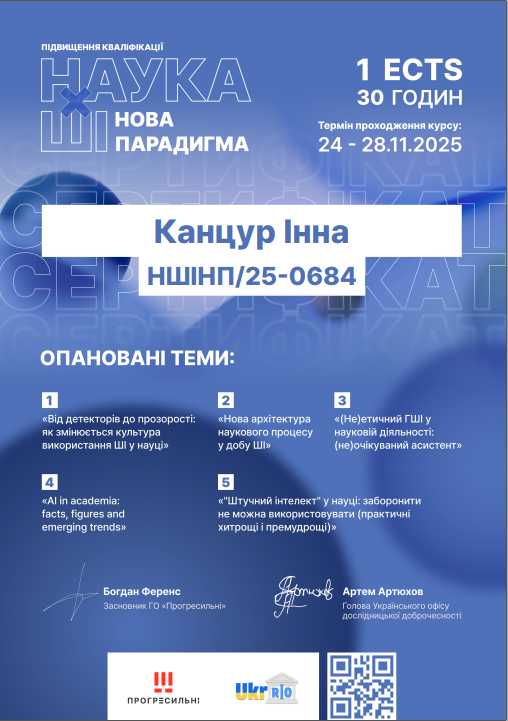 Зважаючи на стрімке зростання ролі штучного інтелекту в науковій та освітній діяльності, Інна Канцур і Наталія Мартинович в листопаді 2025 року долучилися до курсу «Наука ✕ ШІ: нова парадигма», організованого командою ГО «Прогресильні». Особливістю цього курсу стало запрошення практиків і дослідників, які демонстрували прикладні переваги штучного інтелекту для наукового аналізу, підготовки досліджень, пропонуючи інший погляд на його інтеграцію в умовах цифрової трансформації.