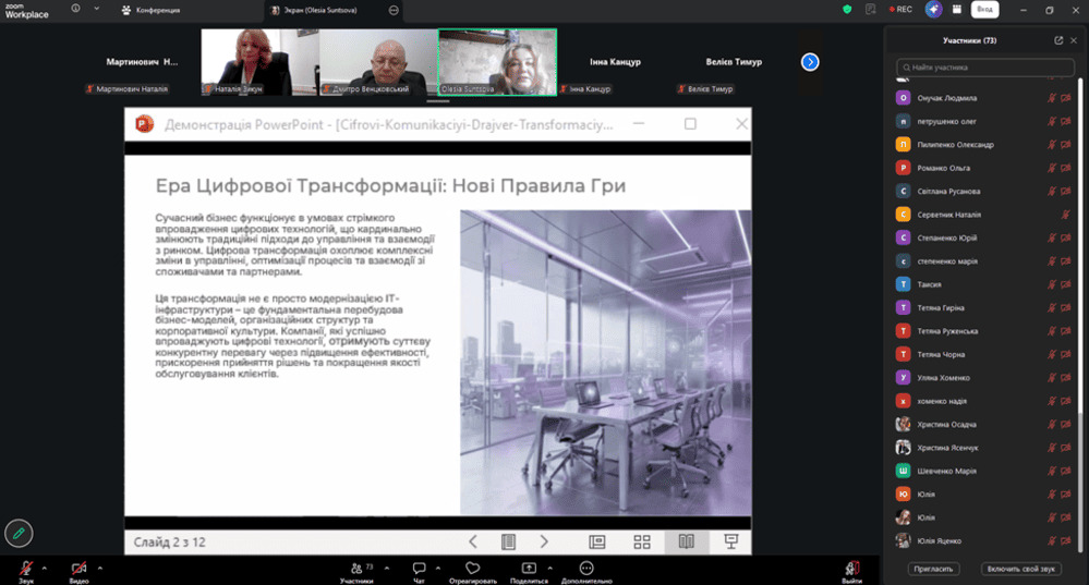 Під час пленарного засідання були представлені актуальні доповіді, що охоплювали питання цифрових трансформацій бізнес-процесів, розвитку переміщених громад, соціальних втрат в умовах війни, трансформації публічного управління, розвитку проєктного менеджменту й міжнародної співпраці. Так, у своїй доповіді професорка Олеся Сунцова наголосила на ролі цифрових комунікацій у трансформації бізнес-процесів, а представник Гірської міської військової адміністрації Віталія Коваленка розкрив нагальні питання переміщених громад, закцентувавши увагу на необхідності збереження соціально-економічного потенціалу територій.