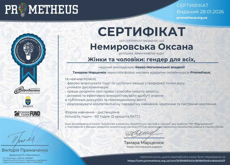 За результатами проходження онлайн-курсів кожен учасник отримав сертифікат та набув практичних знань й компетентностей, необхідних для впровадження принципів рівних прав й можливостей жінок і чоловіків, формування недискримінаційного освітнього середовища та протидії проявам насильства за ознакою статі.