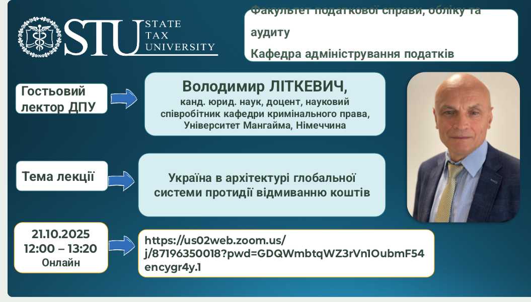 21 жовтня 2025 року в Державному податковому університеті відбудеться онлайн-лекція на тему «Україна в архітектурі глобальної системи протидії відмиванню коштів».