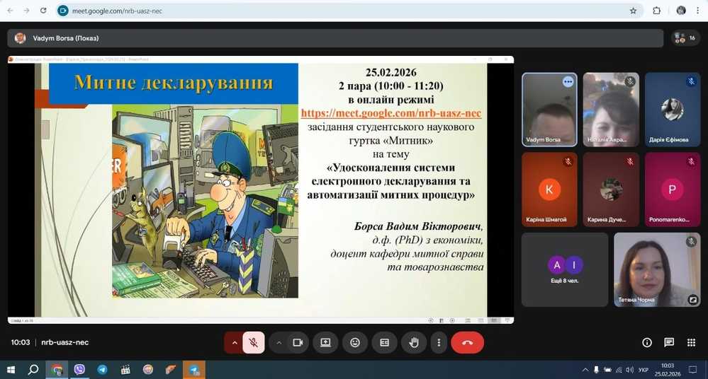 25 лютого 2026 року на кафедрі митної справи та товарознавства в онлайн-форматі відбулося засідання студентського наукового гуртка «Митник». Темою зустрічі стало надзвичайно актуальне питання: «Удоско...