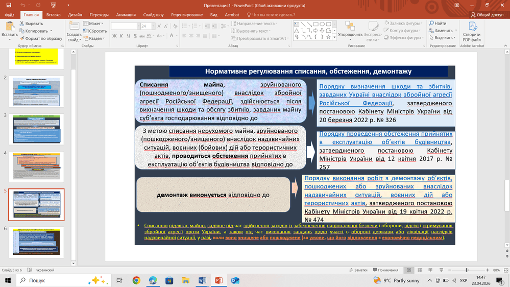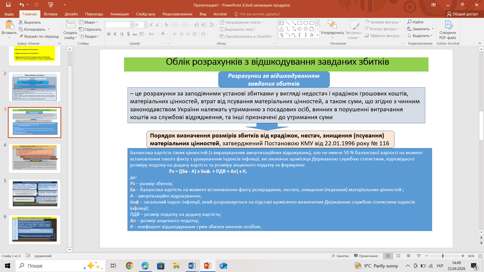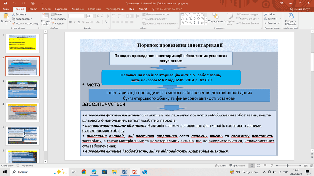 У ході виступу було висвітлено теоретико-методичні засади порядку проведення інвентаризації як важливого елементу системи обліку та контролю. Особливу увагу приділено призначенню, нормативно-правовому регулюванню інвентаризаційних процедур та етапам проведення. Розглянуто порядок документального оформлення результатів інвентаризації, відображення її результатів у бухгалтерському обліку та звітності, а також типові помилки, що виникають під час її проведення. Висвітлено порядок списання об’єктів державної власності за результатами інвентаризації: нормативне регулювання списання, обстеження, демонтажу; порядок прийняття рішення про списання, механізм та особливості списання майна та документальне оформлення результатів роботи комісії зі списання.