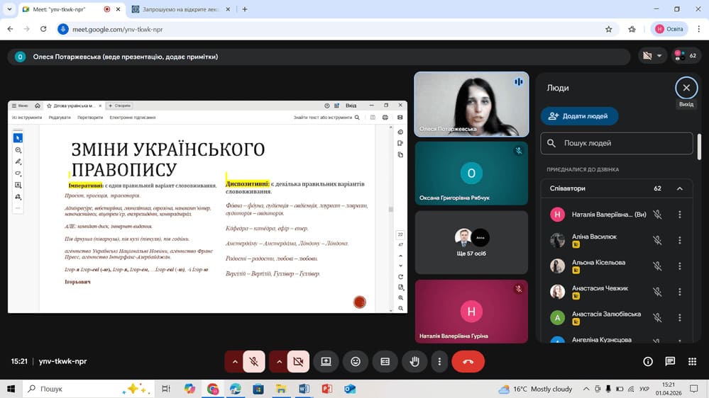 1 квітня 2026 року кафедрою обліку та аудиту була організована гостьова лекція за участю провідної фахівчині у сфері документального забезпечення — Олеся Потаржевська, завідувача сектору літературного редагування Управління документального забезпечення Пенсійний фонд України.