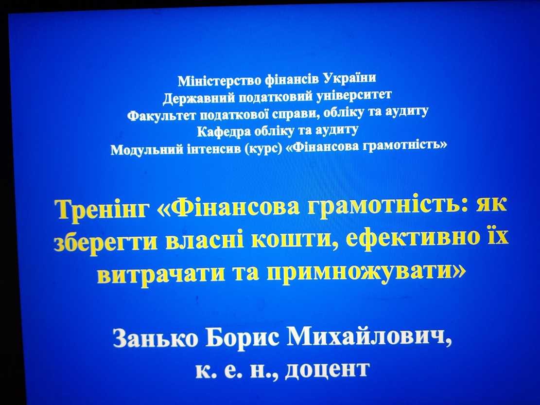 17 лютого 2026 року к.е.н., доцент кафедри обліку та аудиту Занько Борис Михайлович провів тренінг «Фінансова грамотність: як зберегти власні кошти, ефективно їх витрачати та примножувати» для учнів 11-Б та 11-Г класів у Опорному закладі освіти «Софіївсько-Борщагівський ліцей» Борщагівської сільської ради, с. Софіївська Борщагівка Бучанського району Київської області.