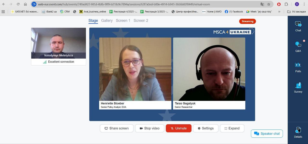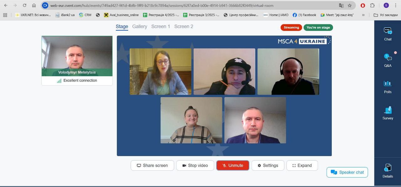 Вебінар об’єднав стипендіатів MSCA4Ukraine, представників європейських науково-дослідних інституцій та університетів, які поділилися досвідом успішної інтеграції українських учених у міжнародні дослідницькі проєкти.