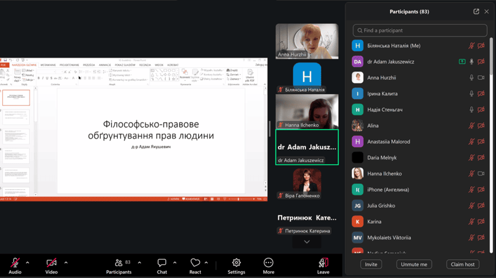 10 квітня 2026 року у ННІ права за ініціативи завідувача кафедри, д.ю.н., професора Вікторії Миколаєць відбулася гостьова лекція для здобувачів вищої освіти за участю іноземного лектора — доктора юридичних наук Адама Якушевича (кафедра міжнародного та конституційного права, факультет права та економіки, Університет імені Казимира Великого, м. Бидгощ, Польща). Захід об’єднав студентів трьох закладів вищої освіти та став майданчиком для спільного обговорення актуальних питань прав людини.