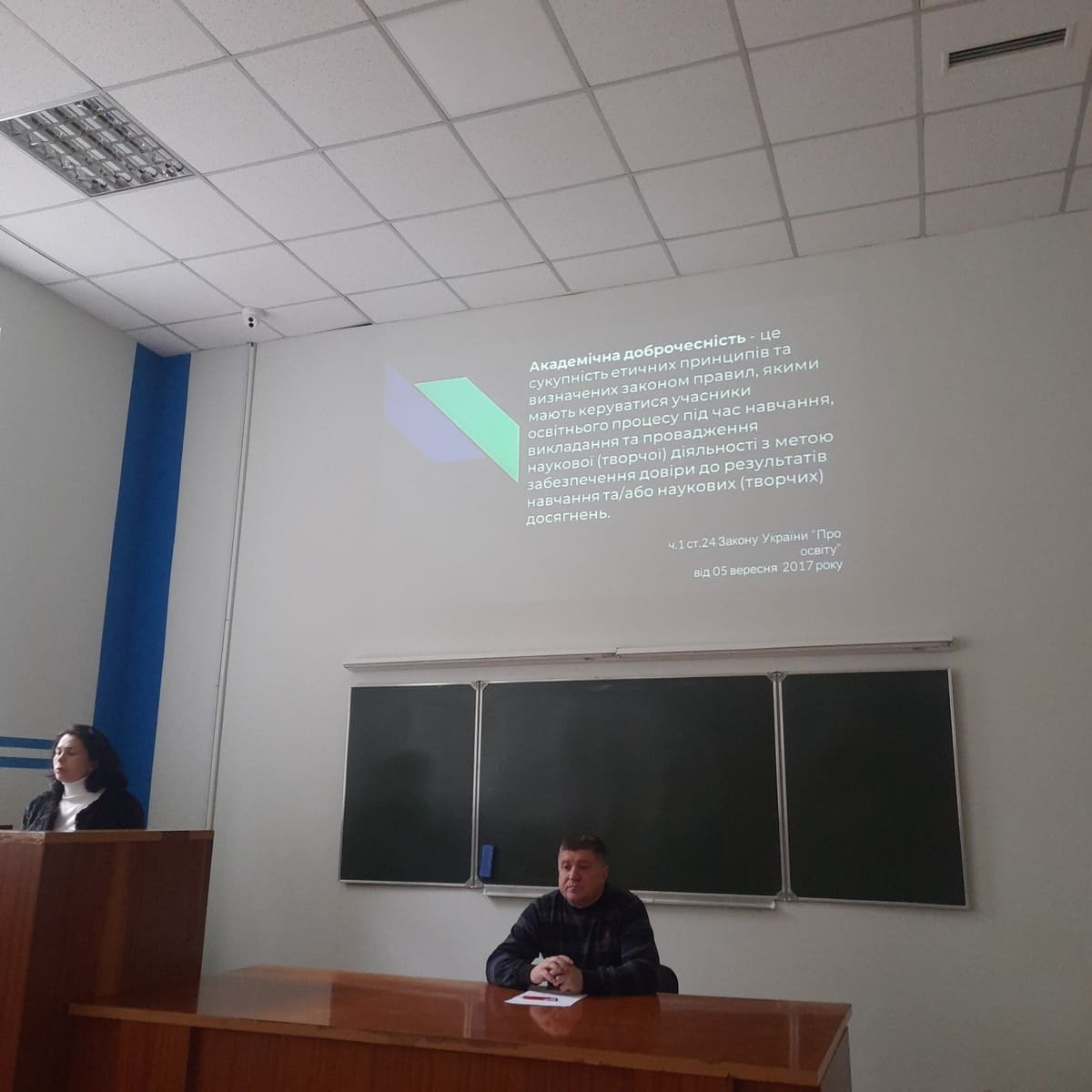 З метою популяризації принципів академічної доброчесності, підвищення обізнаності учасників освітнього процесу про етичні стандарти та дотримання правил чесної науки, в рамках проведення Тижня академічної доброчесності у Навчально-науковому інституті економічної безпеки та митної справи 16.10.2025 відбулася відкрита лекція к.ю.н., доцента, доцента кафедри правоохоронної діяльності Колос Ольги Валеріївни на тему «Академічна доброчесність в Університеті: ключові цінності» для здобувачів першого (бакалаврського) рівня вищої освіти галузі знань К «Безпека та оборона» К 9 «Правоохоронна діяльність» груп ПДБП-25-1, ПДБП-24-1, ПДБП-23-1 (аудиторія D 102).