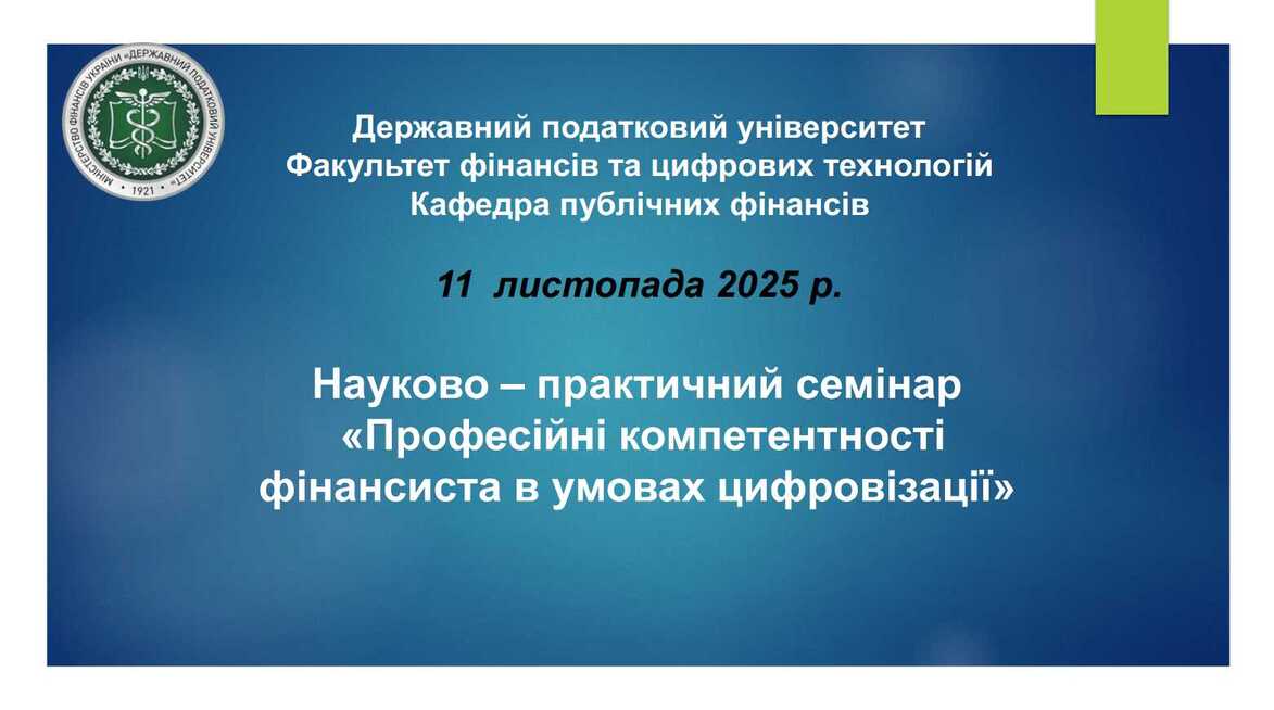 11 листопада 2025 року в Державному податковому університеті відбувся науково-практичний семінар «Професійні компетентності фінансиста в умовах цифровізації». Захід організувала кафедра публічних фіна...