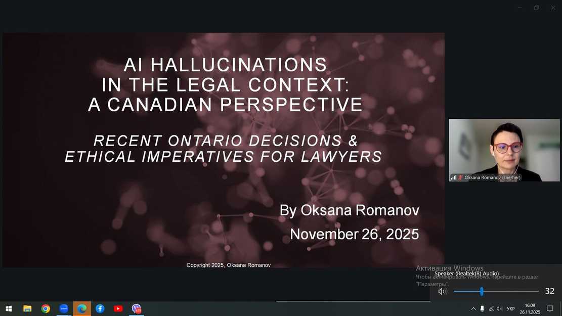 У ході лекції пані Романов пояснила природу ШІ-галюцинацій — вигаданих або неточних судових рішень і правових посилань, які можуть з’являтися під час використання генеративних моделей. Спікерка наголосила, що подібні помилки вже спричинили серйозні професійні наслідки для канадських юристів.