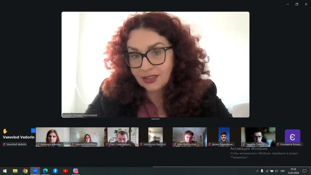 12 березня 2026 року в онлайн-форматі на платформі Zoom відбулася гостьова лекція адвоката, представниці Національної асоціації адвокатів України в Ізраїлі Оксани Соколовської на тему: «Правова система та адвокатура Держави Ізраїль: історія становлення, сучасна модель функціонування та порівняльний аналіз з Україною».