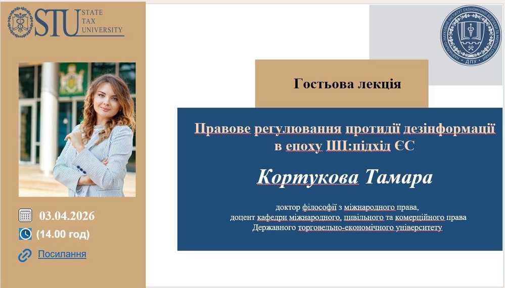 03 квітня 2026 року на кафедрі фінансових розслідувань та економічної безпеки відбулася гостьова лекція на тему: «Правове регулювання протидії дезінформації в епоху штучного інтелекту: підхід ЄС».