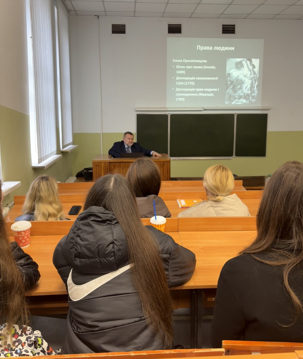 Особливу увагу було приділено принципам міжнародного гуманітарного права, а також сучасним викликам у сфері його реалізації в умовах збройної агресії проти України. Студенти виявили значний інтерес до теми, активно ставили запитання та отримали вичерпні й професійні відповіді від лектора, що сприяло поглибленню їх правової культури та розуміння міжнародних стандартів правосуддя.