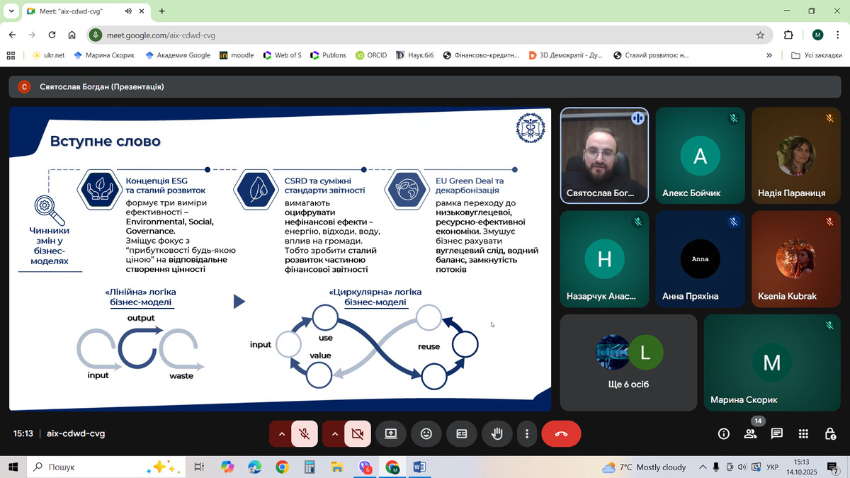Під час виступу лектор запропонував слухачам глибокий погляд на сучасну еволюцію бізнес-моделей — від лінійної логіки input–output–waste до циркулярної input–use–reuse–value, що трансформує уявлення про ефективність, прибутковість та сталість бізнесу.