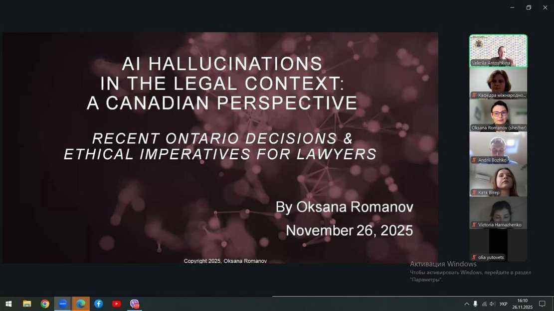 Студенти та викладачі Інституту права ДПУ зустрілися з канадською адвокаткою та колишньою урядовою прокурorkою провінції Онтаріо Оксаною Романов. Тема лекції — ШІ-галюцинації в юридичній практиці та те, як канадські суди встановлюють правила гри для нової технології.
