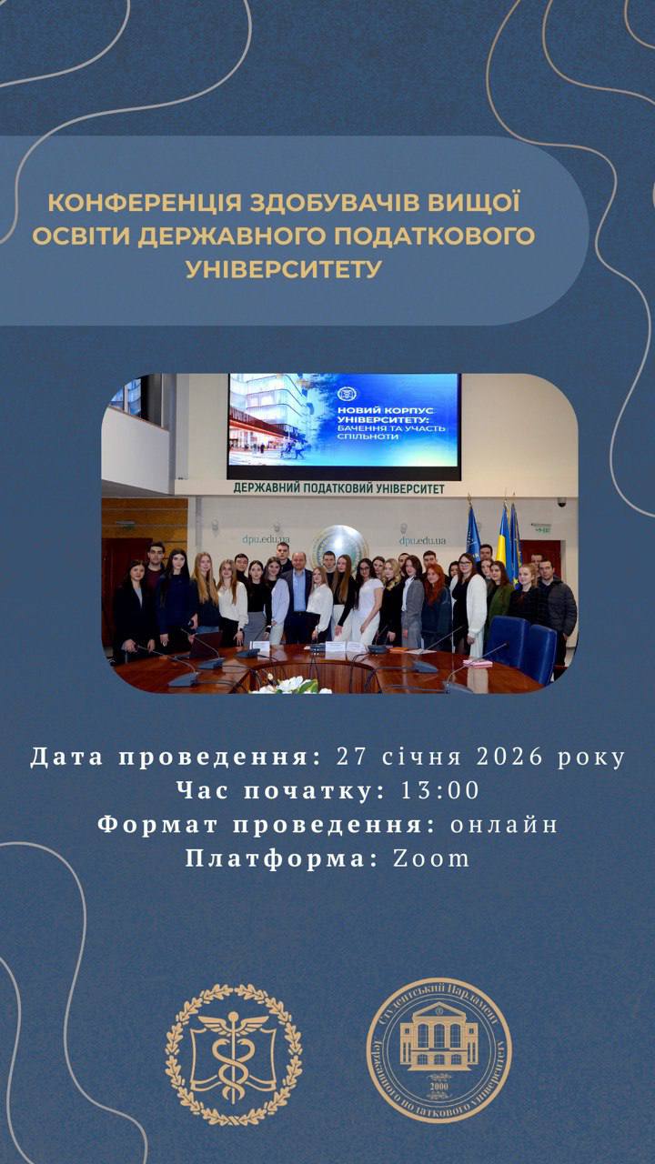 27 січня о 13:00 відбудеться онлайн-конференція здобувачів вищої освіти Державного податкового університету. Захід проходитиме на платформі Zoom.
