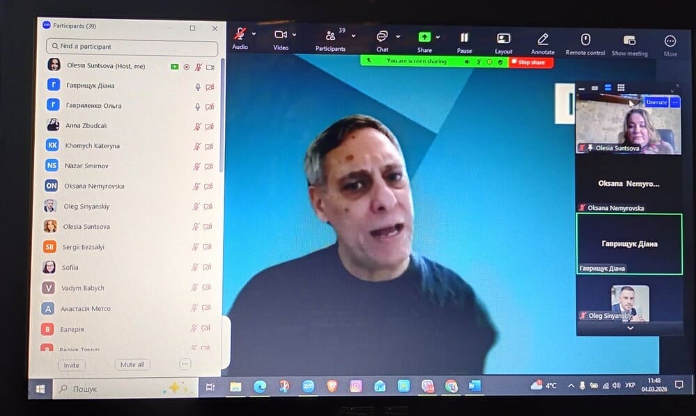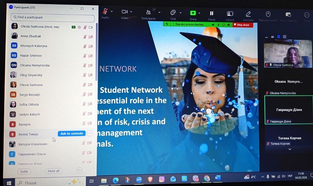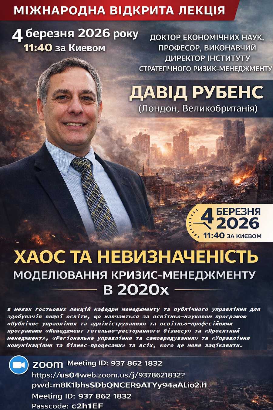 4 березня 2026 року відбулась міжнародна відкрита лекція від доктора економічних наук, професора, виконавчого директора Інституту стратегічного ризик-менеджменту – Давіда Рубенса (Лондон, Великобританія) на тему «Хаос та невизначеність: моделювання кризис-менеджменту в 2020х» в межах гостьових лекцій кафедри менеджменту та публічного управління для здобувачів вищої освіти, що навчаються за освітньо-науковою програмою «Публічне управління та адміністрування» та освітньо-професійними програмами «Менеджмент готельно-ресторанного бізнесу» та «Проєктний менеджмент», «Регіональне управління та самоврядування» та «Управління комунікаціями та бізнес-процесами» та всіх, кого це може зацікавити.