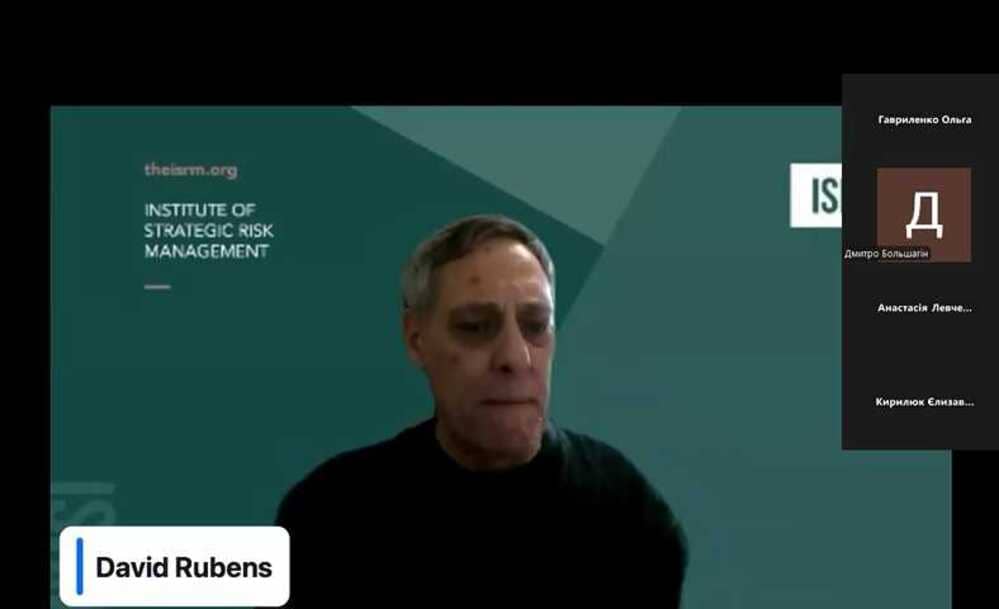 У своєму виступі «Chaos & Complexity: Modelling Crisis Management in the 2020’s» Девід Рубенс наголосив, що рамки стратегічного управління ризиками та кризами, сформовані після Другої світової війни, більше не є достатньо міцними для моделювання, взаємодії чи реагування на сучасні кризові події. Лектор розглянув ключові виклики розуміння поточних криз та необхідні підходи для ефективної підготовки й реагування на них. Лекція супроводжувалася яскравими прикладами з світової практики та дискусією з аудиторією.
