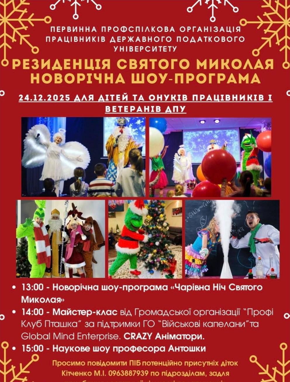 Запрошуємо дітей та онуків працівників Державного податкового університету на Новорічне свято до Святого Миколая!
