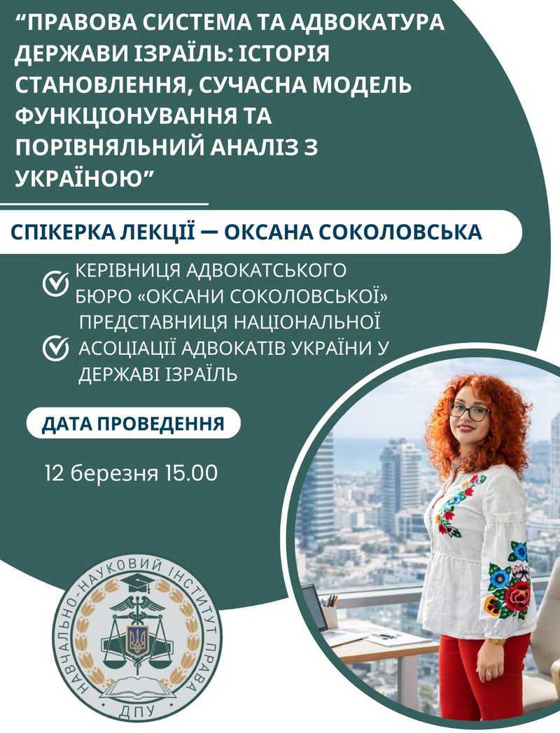 Запрошуємо здобувачів вищої освіти Державного податкового університету, викладачів та всіх охочих відвідати гостьову лекцію на тему: «Правова система та адвокатура Держави Ізраїль: історія становлення, сучасна модель функціонування та порівняльний аналіз з Україною».