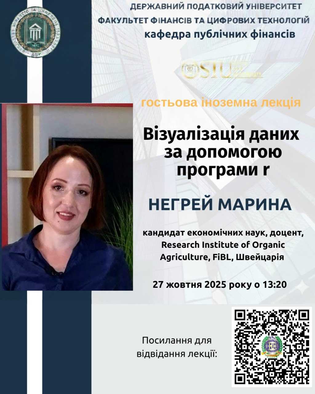 You are invited to a Guest Lecture by Maryna Nehrei , Maryna Nehrey, PhD, Associate Professor, Research Institute of Organic Agriculture, FiBL, Switzerland