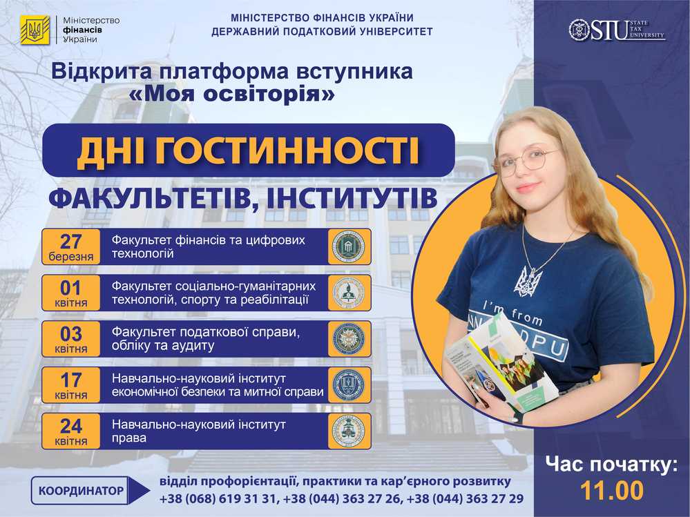З 27 березня до 24 квітня факультети та інститути Державного податкового університету розпочинають цикл зустрічей у форматі відкритої платформи вступника «Моя освіторія».