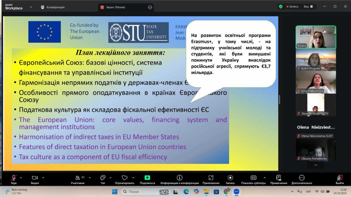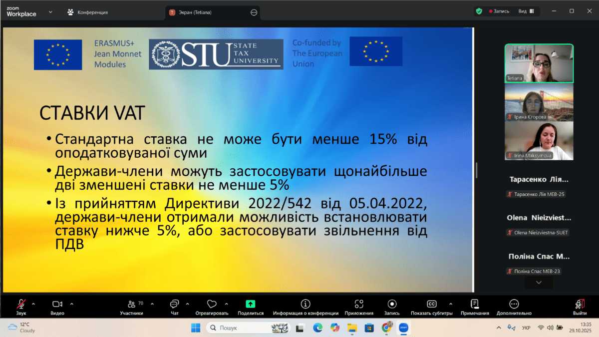 29 жовтня 2025 року в рамках виконання грантового проєкту Erasmus+ Модуля Жана Моне «Формування стійкого інтересу до податкової культури ЄС шляхом запровадження освітніх, наукових та комунікативних просвітницьких заходів, орієнтованих на українське суспільство» (Грантова Угода № 101125984 – TIEU) в Державному університеті економіки і технологій (м. Кривий Ріг) відбулася гостьова лекція кандидата економічних наук, доцента, доцента кафедри адміністрування податків Державного податкового університету Тетяни ТУЧАК на тему «Податкова політика ЄС як вектор розвитку зовнішньоторговельної політики України»/ «EU tax policy as a vector for the development of Ukraine's foreign trade policy». Модератором зустрічі виступила Єгорова Ірина Геннадіївна, к.е.н., доцент, доцент кафедри міжнародних відносин Навчально-наукового інституту економіки та бізнес-освіти.
