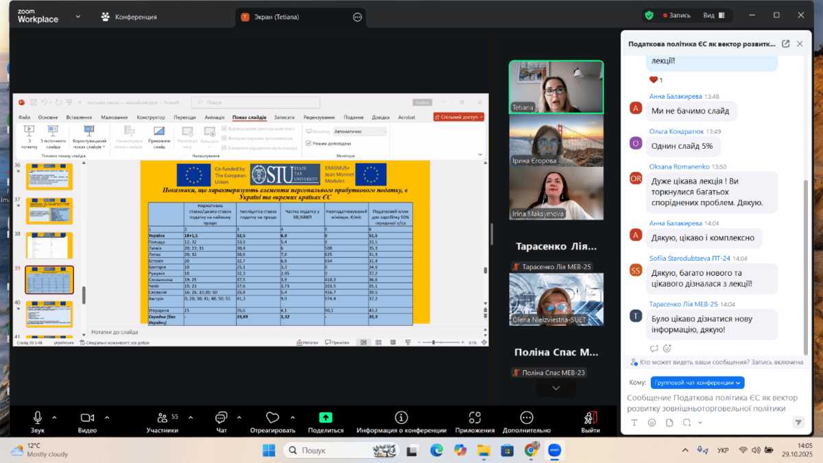 Слухачі занурилися у важливу сферу податкової політики ЄС, адже саме від її принципів і механізмів залежать темпи євроінтеграції України, розвиток міжнародної торгівлі, прозорість бізнес-середовища та створення рівних конкурентних умов для українських підприємств на європейських ринках. Майбутні економісти, фінансисти, журналісти й підприємці мають змогу осмислити, як спільні податкові стандарти та «зелені» фіскальні інструменти формують нову архітектуру економічних відносин України з ЄС.