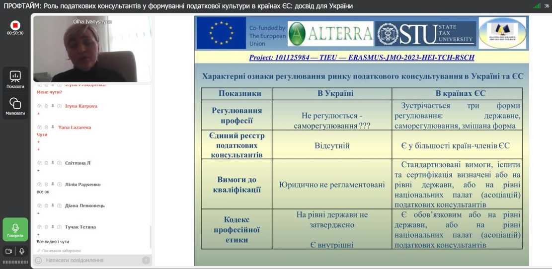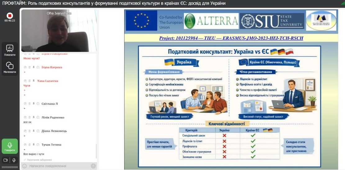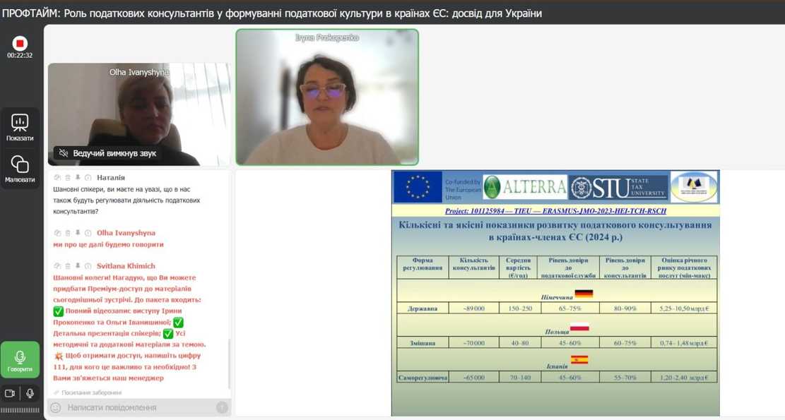 Під час заходу спікери Ольга Іванишина, к.е.н., доцент, завідувач кафедри адміністрування податків Факультету податкової справи, обліку та аудиту Державного податкового університету та Ірина Прокопенко, к.е.н., доцент кафедри адміністрування податків ознайомили учасників з особливостями професійної діяльності податкових консультантів у країнах ЄС та проаналізували моделі регулювання професії на прикладі окремих держав-членів ЄС. Окрему увагу було приділено впливу діяльності податкових консультантів на формування податкової культури, забезпечення добровільної податкової дисципліни та важливу роль податкового консультанта в країнах ЄС як посередника між платником податків і податковими органами.