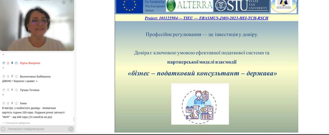 17.02.2026 відбувся вебінар для учасників проєкту «ПрофТайм» Міжнародного методологічного, навчального та екзаменаційного центру у сфері професійних бізнес-кваліфікацій та стандартів «Аль-Терра» в рамках виконання проєкту ЄС Еразмус+ Модуль Жана Моне «Формування стійкого інтересу до податкової культури ЄС шляхом запровадження освітніх, наукових та комунікативних просвітницьких заходів, орієнтованих на українське суспільство»