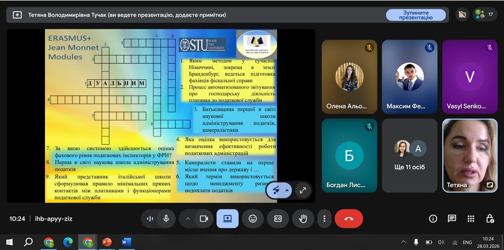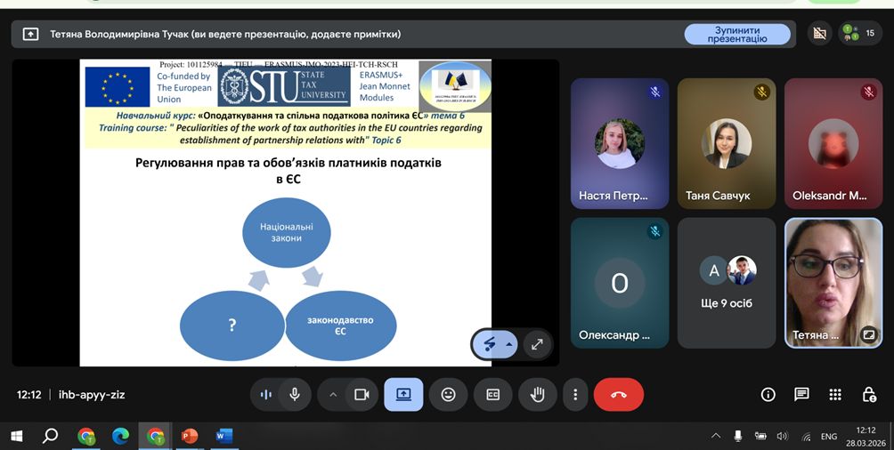 28.03.2026 року в Державному податковому Університеті завершено заняття з факультативного курсу: «Оподаткування та спільна податкова політика ЄС» на другому році виконання Проєкту ЄС Еразмус+ «Формування стійкого інтересу до податкової культури ЄС шляхом запровадження освітніх, наукових та комунікативних просвітницьких заходів, орієнтованих на українське суспільство» 101125984 – TIEU – ERASMUS-JMO-2023-HEI-TCH-RSCH (Грантова Угода № 101125984 -TIEU).