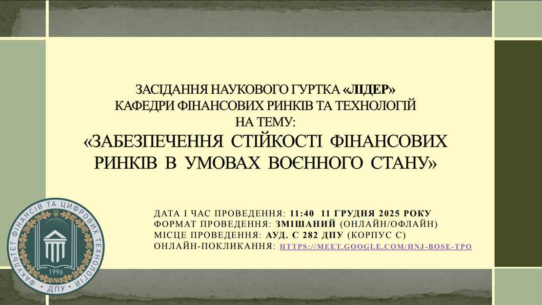 11 грудня 2025 року об 11:40 відбудеться планове засідання студентського наукового гуртка «ЛІДЕР» кафедри фінансових ринків та технологій на тему «Забезпечення стійкості фінансових ринків в умовах воє...