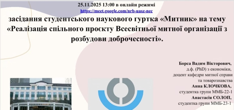 25 листопада 2025 року на кафедрі митної справи та товарознавства в форматі онлайн відбулося чергове засідання студентського наукового гуртка «Митник» . Тема засідання: «Реалізація спільного проєкту В...