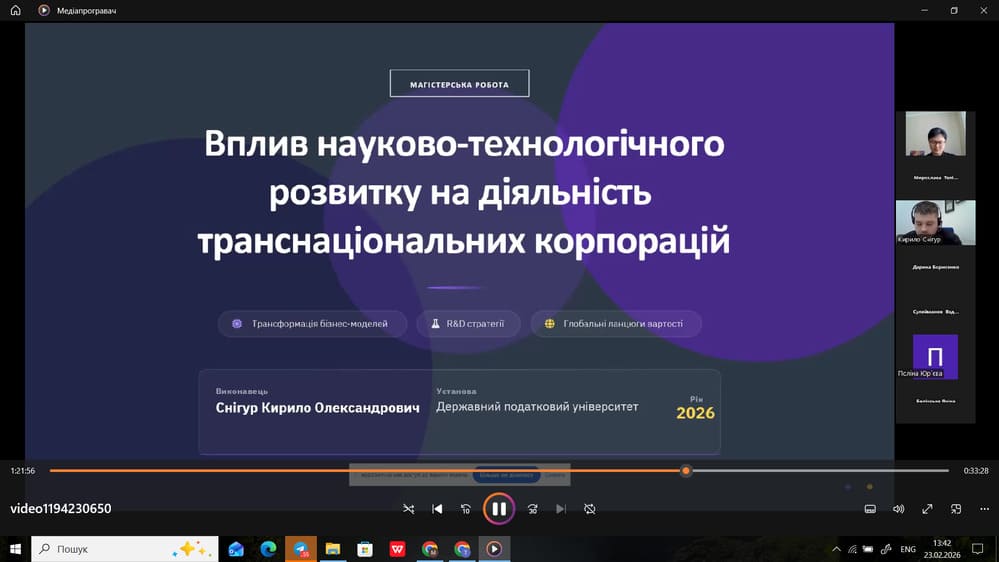 4 лютого 2026 року в Державному податковому університеті відбувся захист кваліфікаційних робіт здобувачів вищої освіти другого (магістерського) рівня вищої освіти, денної форми навчання групи МЕМз-24-1, що навчалися за освітньо-професійною програмою «Міжнародна економіка». Захист пройшов у відкритому форматі та засвідчив високий рівень фахової підготовки здобувачів вищої освіти. Головою екзаменаційної комісії призначено Дем’янчук Ольга Іванівна, д.е.н., професор, професор кафедри фінансів та бізнесу, директор Навчально-наукового інституту міжнародних відносин та національної безпеки Національного університету «Острозька академія».