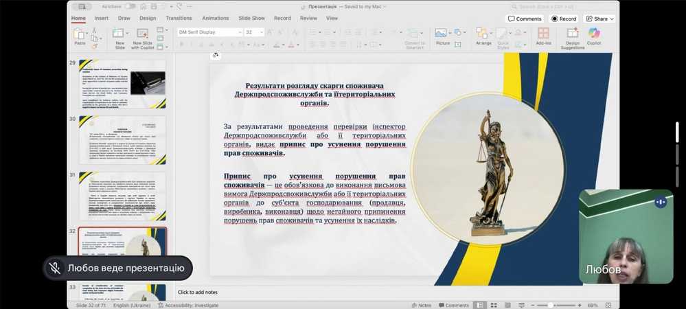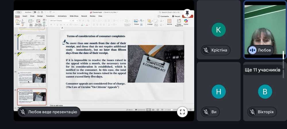 Матеріал викладався українською та англійською мовами, що підкреслило актуальність володіння англійською у професійній діяльності. Здобувачі проявили високий рівень зацікавленості та активно брали участь у занятті. Особливу увагу було приділено розбору практичних кейсів із реальних ситуацій захисту прав споживачів. Це дозволило краще зрозуміти механізми застосування теоретичних знань на практиці. Під час аналізу кейсів здобувачі висловлювали власні думки та пропонували шляхи вирішення проблем. Використання англійської мови під час обговорення сприяло розвитку професійної комунікації. Атмосфера була жвавою та сприятливою для навчання. У результаті заняття сприяло підвищенню як фахових, так і мовних компетентностей.