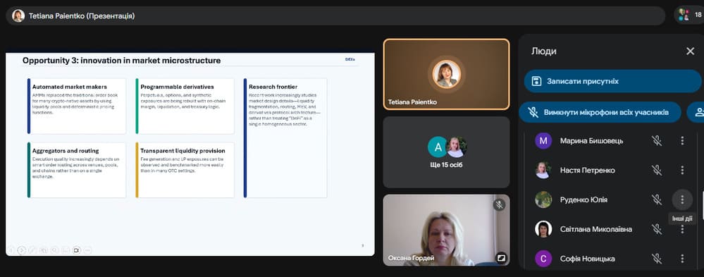 У змісті лекції було розкрито сутність та перспективи розвитку децентралізованих фінансів (DeFi), окреслено ключові виклики для глобальної фінансової системи, а також наведено приклади практичного застосування технологій у сучасному світі. Високий професіоналізм лекторки, її глибокий аналіз та вміння доступно пояснювати складні концепції викликали щиру зацікавленість слухачів.